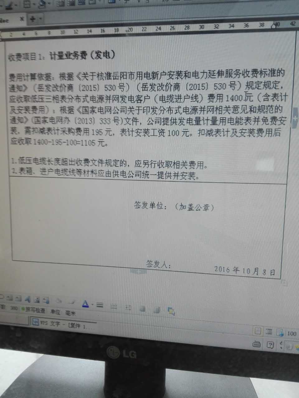 2、并网前以容量超过5KW需要另购计量表为由收取2400元费用,在多方反应情况后,还是按照岳发改价商【2015】530号《关于核准岳阳市用电新户安装和电力延伸服务收费标准的通知》以单相改三相的名义收取了1650元费用,在征得业主同意后以预交电费的形式退还了750元。