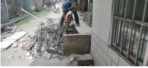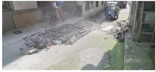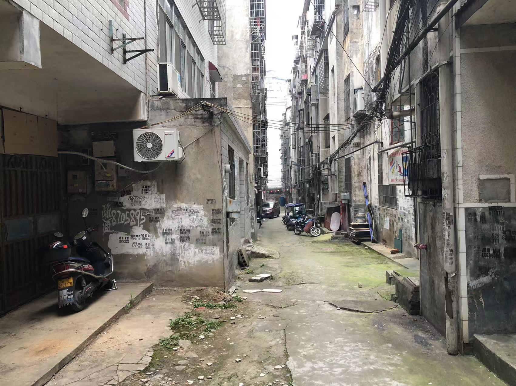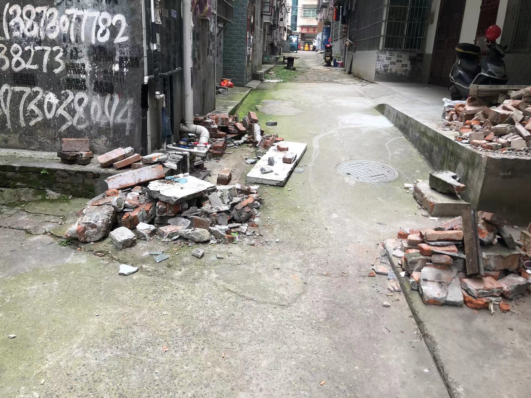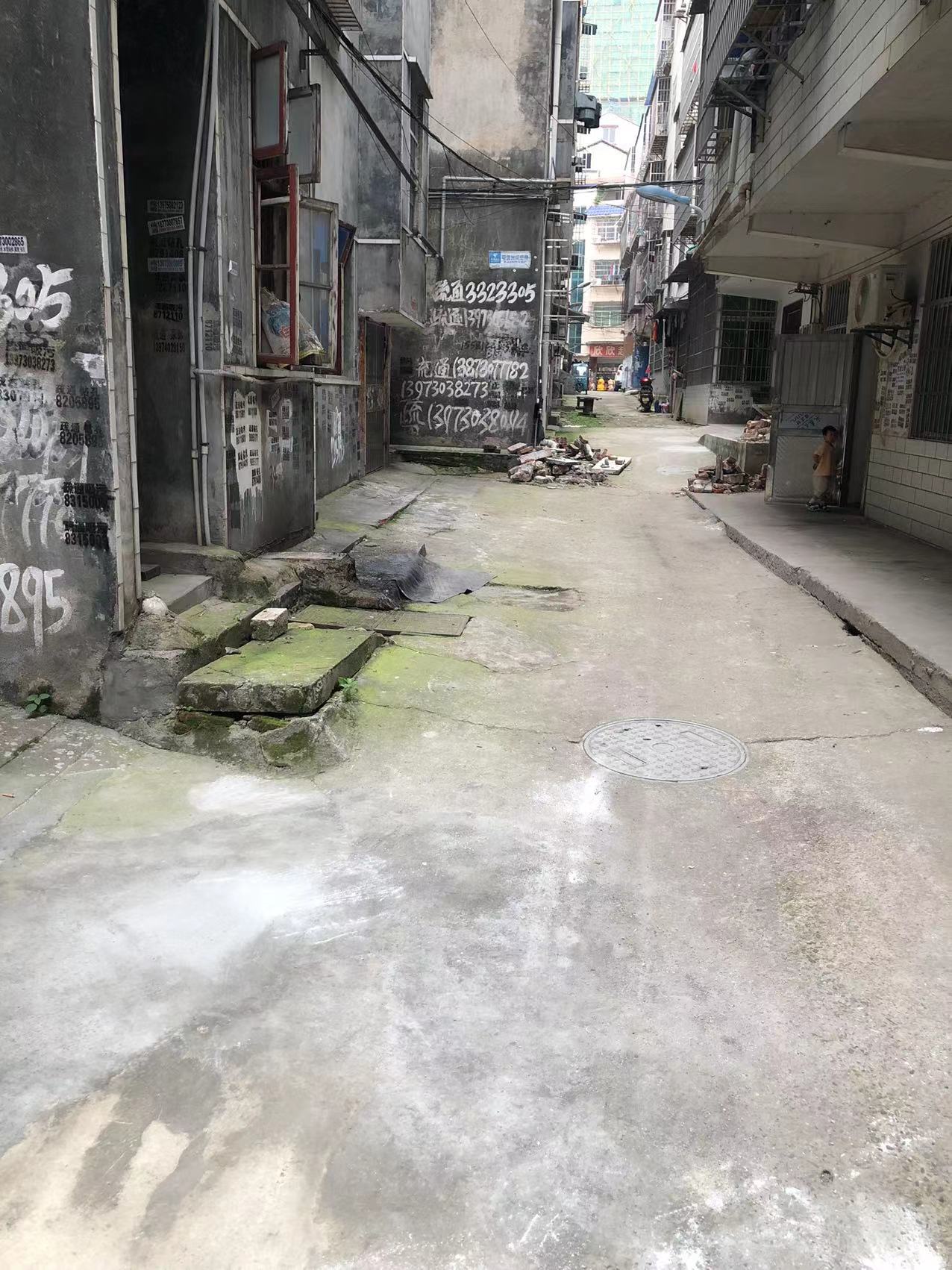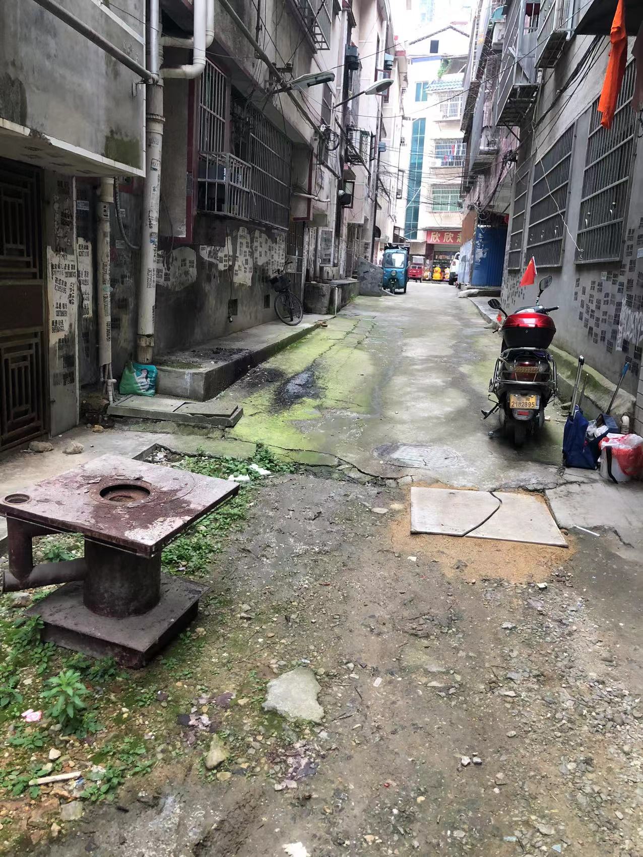 这边都是二十多年的私房,原本地基规划就是参差不齐,五排房子没有一条巷子是直的,原本三米多宽的通道还被各种违章建筑占用,有的水表井盖高出地面二三十厘米,有的直接在屋前搭棚,把通道占用得只剩两米多宽。