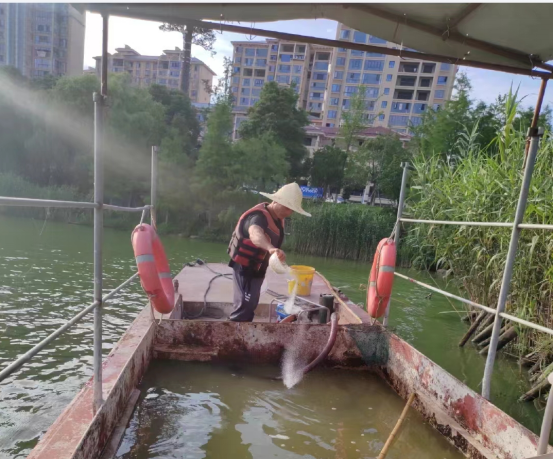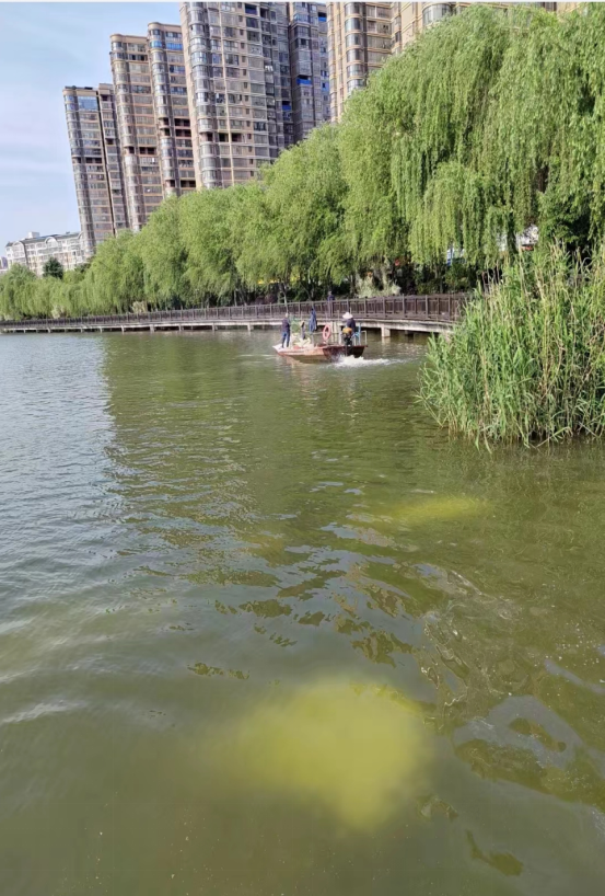 我局已安排公用事业服务中心人员现场查勘,由于天气炎热气温较高,东湖出现蓝藻滋生现象,我们已经第一时间采取了药剂的消杀和生石灰的投放净化水体。气温越高蓝藻滋生速度比较快,蓝藻消杀后我们还会及时补换湖水。 我局工作人员高某电话(182****1104)已与您联系, 由此给您带来的不便,请理解。