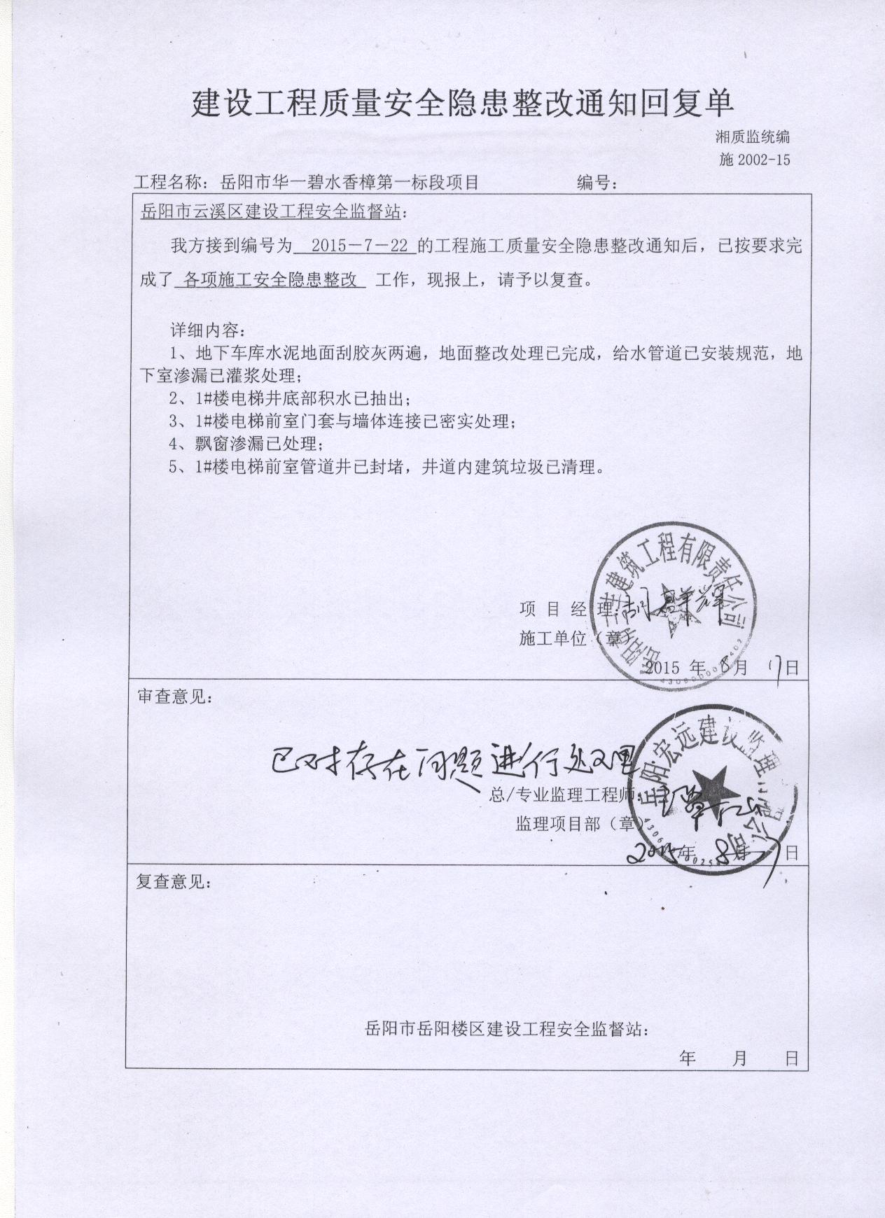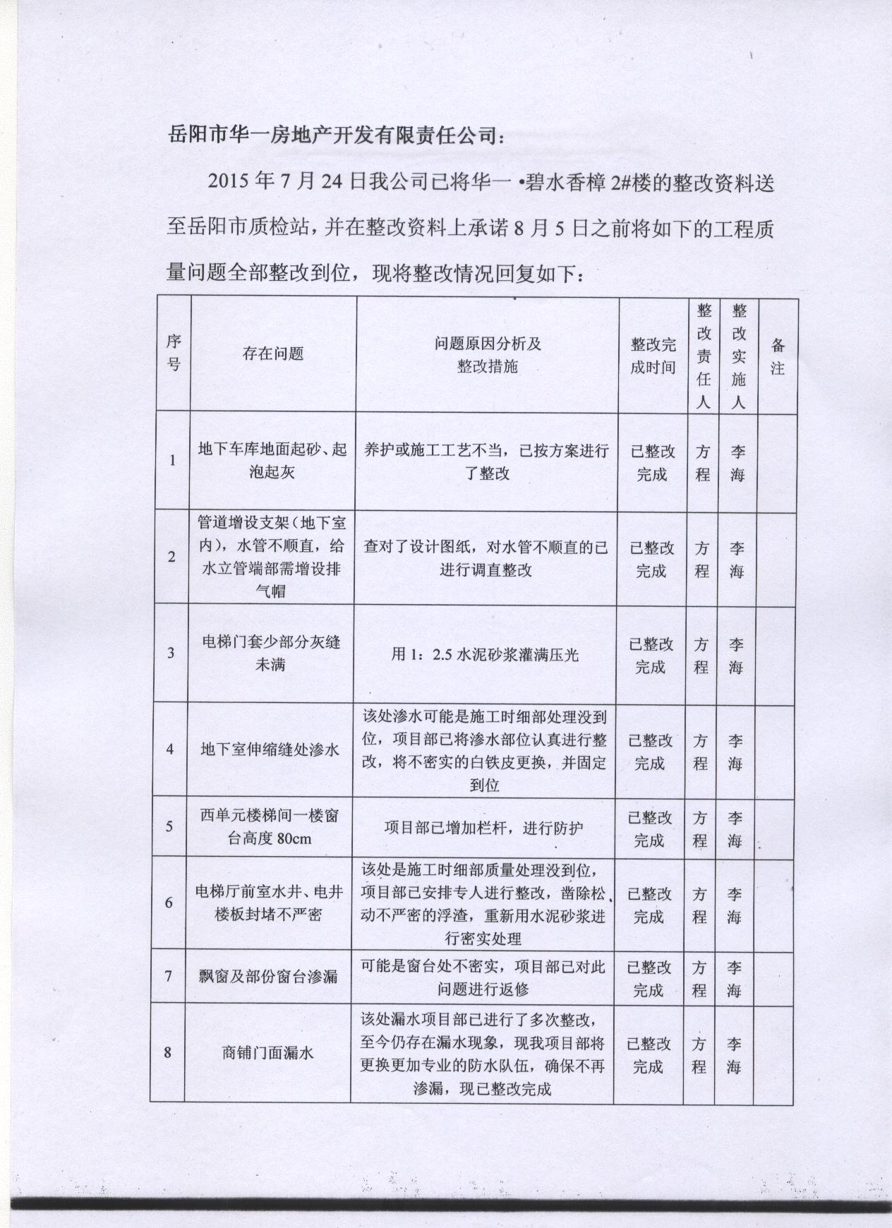 1、市质安处于201558组织召开了碧水香樟1#2#楼各参建责任主体单位主要责任人会议,要求必须尽快就存在的工程质量问题拿出整改方案,并明确整改时间和整改负责人。