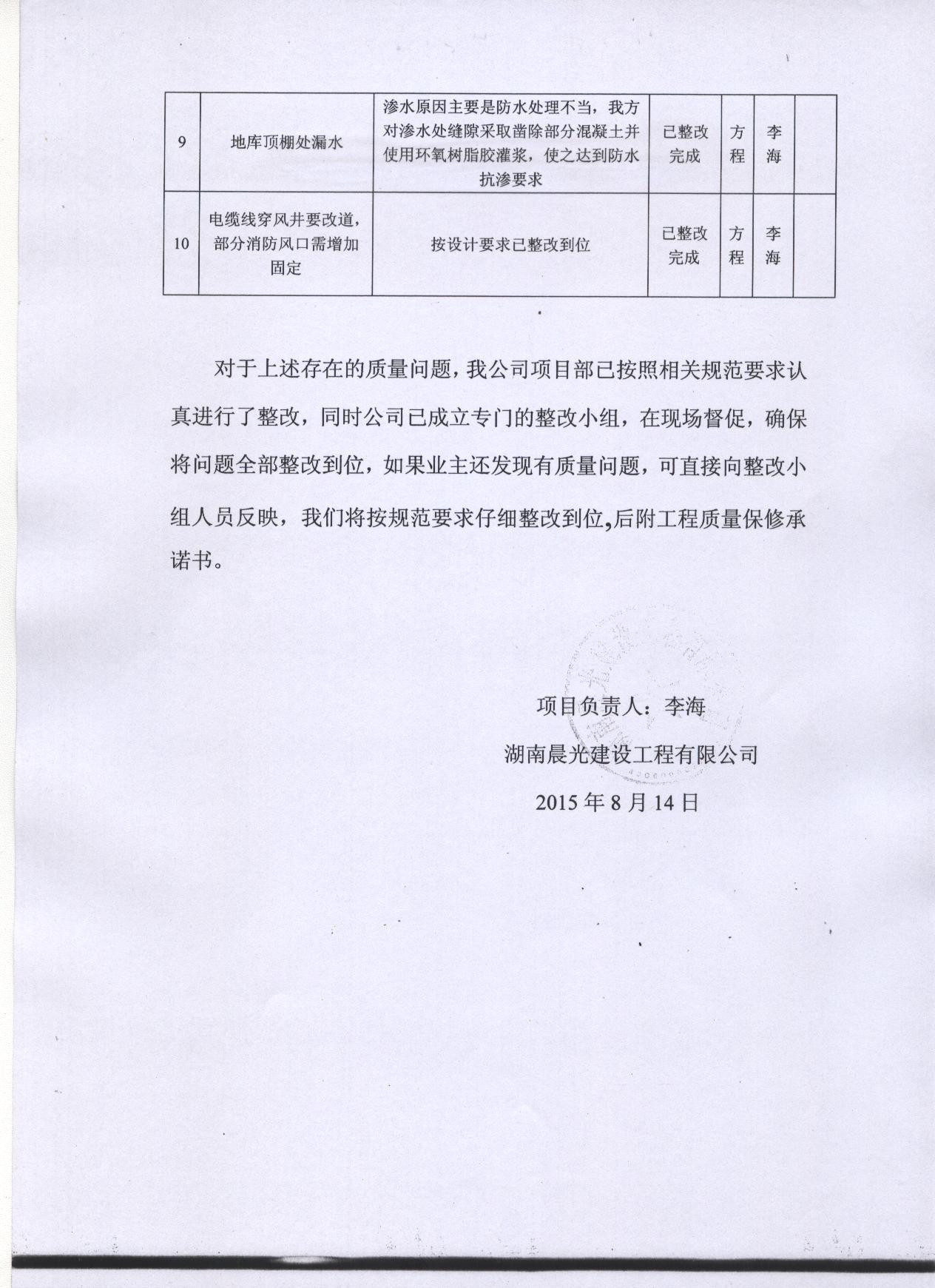 4、对于总包单位施工范围内存在的质量缺陷,各责任主体单位均承诺只要发现就会立即整改到用户满意为止。
