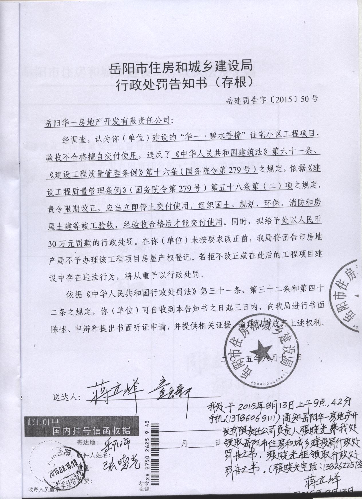 一、基本情况:华一碧水香樟1#2#楼位于岳阳市洞纺生活区内,两栋均为地下1层,地上26层,建筑面积约50000平方米,该工程于20126月开工建设,20144月基本完工,建设单位(即开发单位)一直未组织由开发单位、勘察单位、设计单位、施工单位、监理企业五方责任主体参加的竣工验收。针对上述情况,我局专门监督机构岳阳市建设工程质量安全监督处(以下简称市质安处)已于2015129下达了立即停止使用的告知书(岳质监告字( 2015)0101号)。