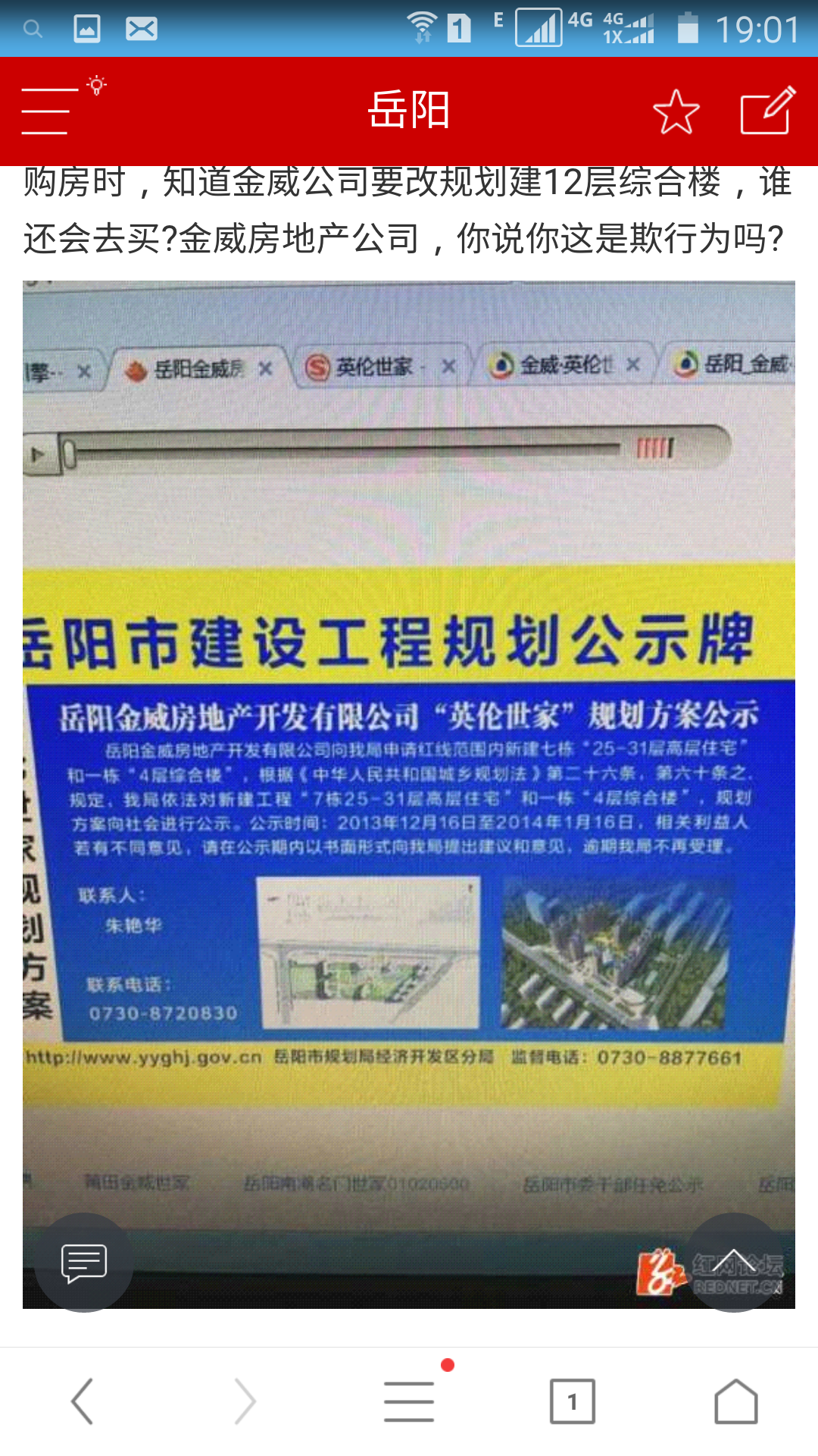 我们是岳阳市英伦世家小区住户,该小区公示的规划里,是建7栋住宅楼和1栋四层综合楼。综合楼在1栋住宅边,建4层对住户影响不大。现在我们出钱购买了住房,而开发商金威房地产开发公司却要将4层综合楼改建为12层.影响到1栋住户视野,通风,阳光等。 我们坚决反对更改综合楼规划,请岳阳市规划局领导实地调查,与我们业主联系,切实考虑我们诉求。 |