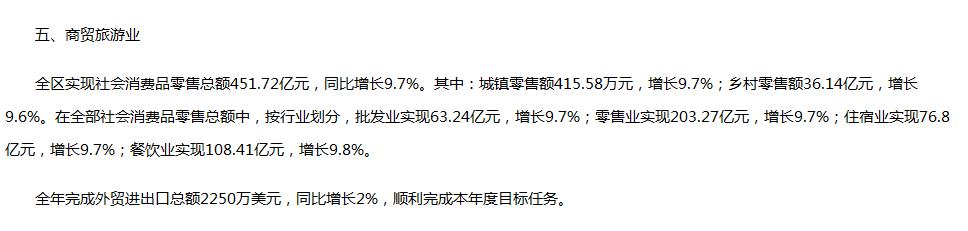 查找数据时发现《岳阳楼区2018年国民经济和社会发展统计公报》其中第五点商贸旅游业的数据中:全区实现社会消费品零售总额451.72亿元,同比增长9.7%。其中:城镇零售额415.58万元,增长9.7%;乡村零售额36.14亿元;