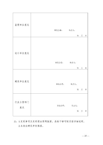 监理单位意见 单位公章: 负责人: 年 月 日 设计单位意见 单位公章: 负责人: 年 月 日 建设单位意见 单位公章: 负责人: 年 月 日 行业主管部门 单位公章: 负责人: 意见 年 月 日 注:1.变更事项及变更理由简明扼要,表格不够可附另册详细说明。 2.本表由建设单位填报。 — 25 —