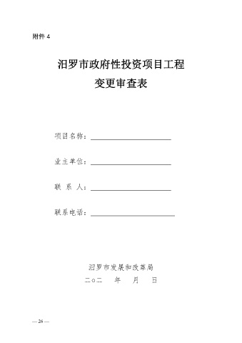 附件 4 汨罗市政府性投资项目工程 变更审查表 项目名称: 业主单位: 联 系 人: 联系电话: 汨罗市发展和改革局 二○二 年 月 日 — 26 —