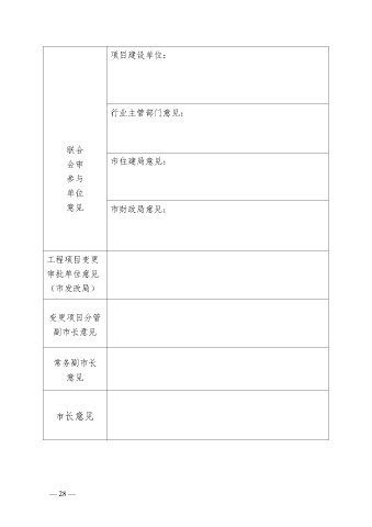 项目建设单位: 行业主管部门意见: 联合 会审 市住建局意见: 参与 单位 意见 市财政局意见: 工程项目变更 审批单位意见 (市发改局) 变更项目分管 副市长意见 常务副市长 意见 市长意见 — 28 —
